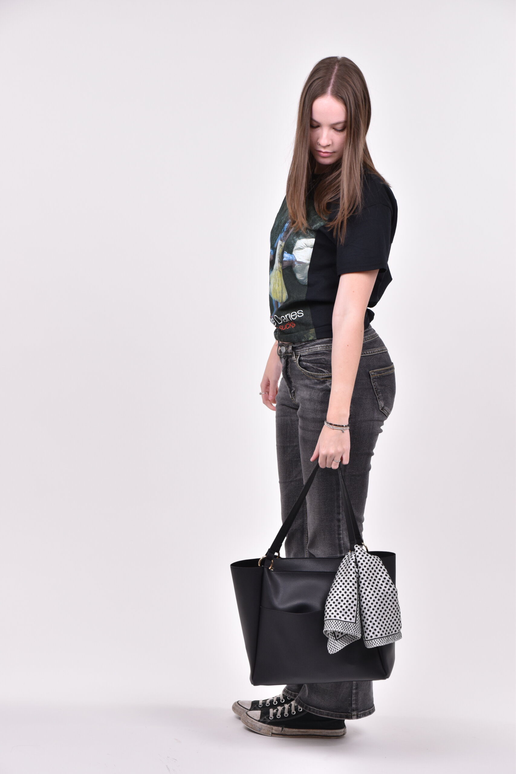 For my second look I styled my scarf on my bag. I put it through the loop connected to the handle and didn’t tie it so that it hung down nicely. I think this makes a plain bag look fun. I have a scarf on my most used bag every day!