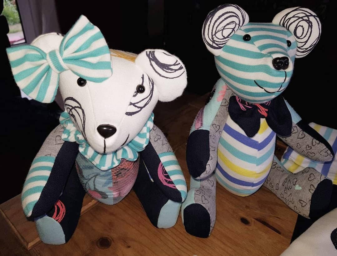 Loved one’s clothes are sewn together to create these memory bears.