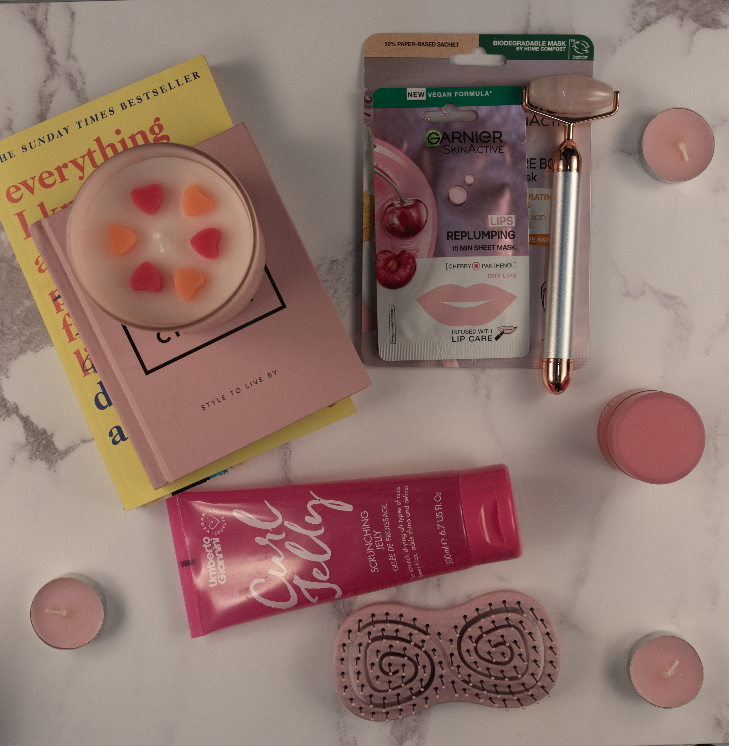 For the first flatlay, I went with ‘the contents of a girl’s bedside table’ featuring the important items that a girl would grab regularly after waking up or before bed. For example books, skincare, lip balm, hair brush, candles, haircare, flowers, trinkets and decoration.