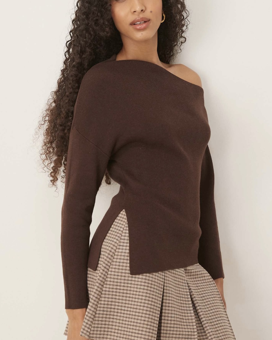 Off-shoulder pieces are in. ASOS’ knitted asymmetrical top would go well with anything from trousers to skirts to jeans, available now for only £26.