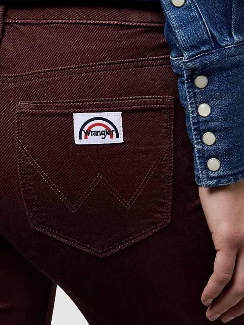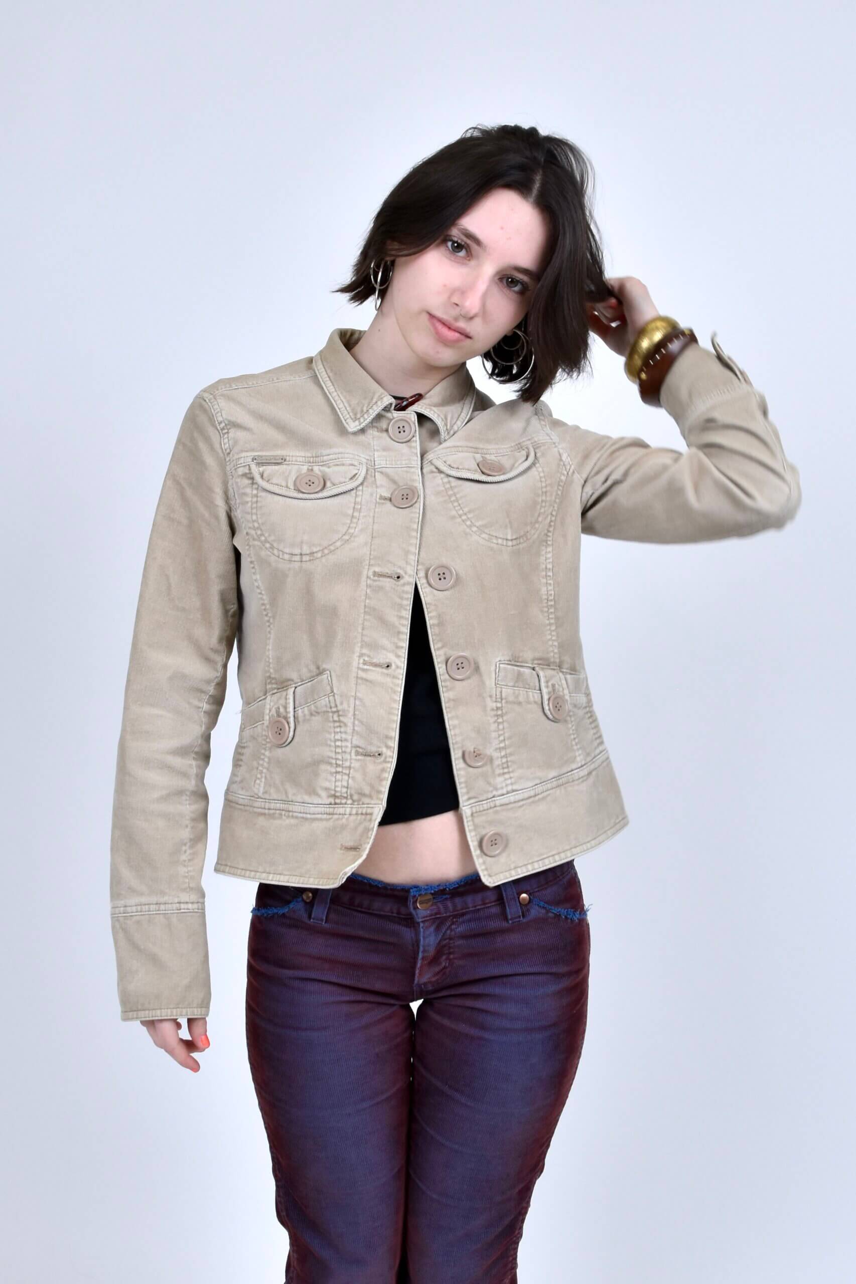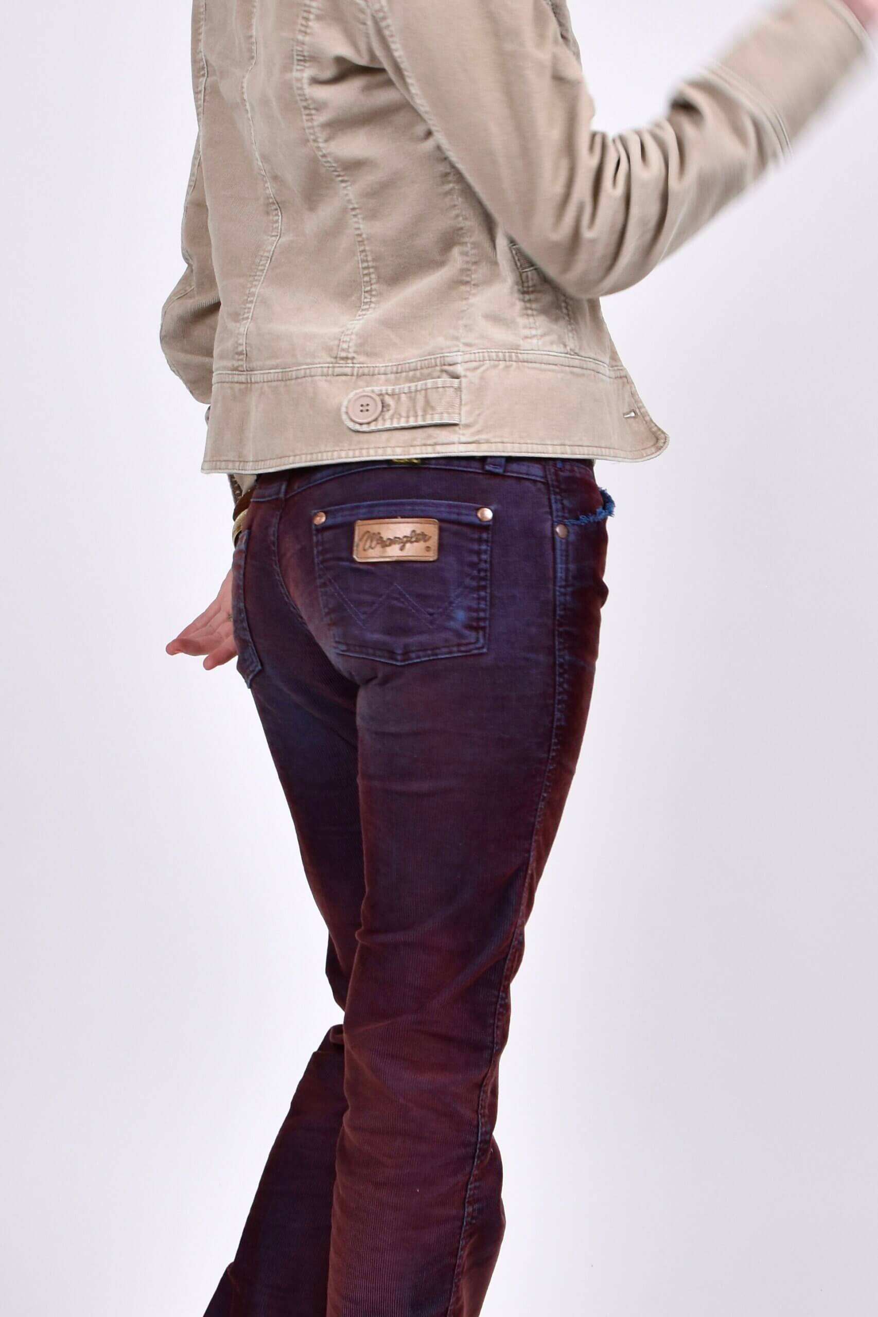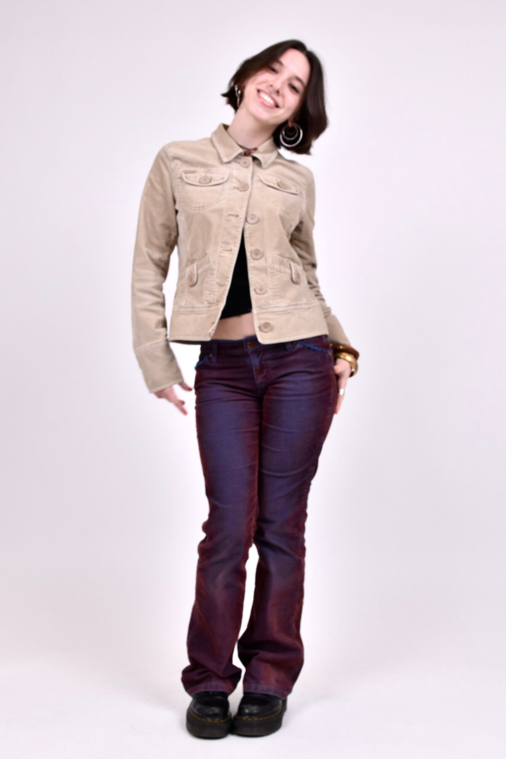 For this shoot, I styled a cream corduroy jacket that I bought from Depop for £32. I love its detailed button features that give the piece so much character, and the early 2000s vintage feel. My jeans are also from Depop for £37, described as vintage low-rise bootcut Wrangler jeans in burgundy. While they’re said to be burgundy red, the corduroy sits over a blue base fabric, which gives them a subtle purple tone when worn. This hidden detail adds so much depth that is often complimented.
