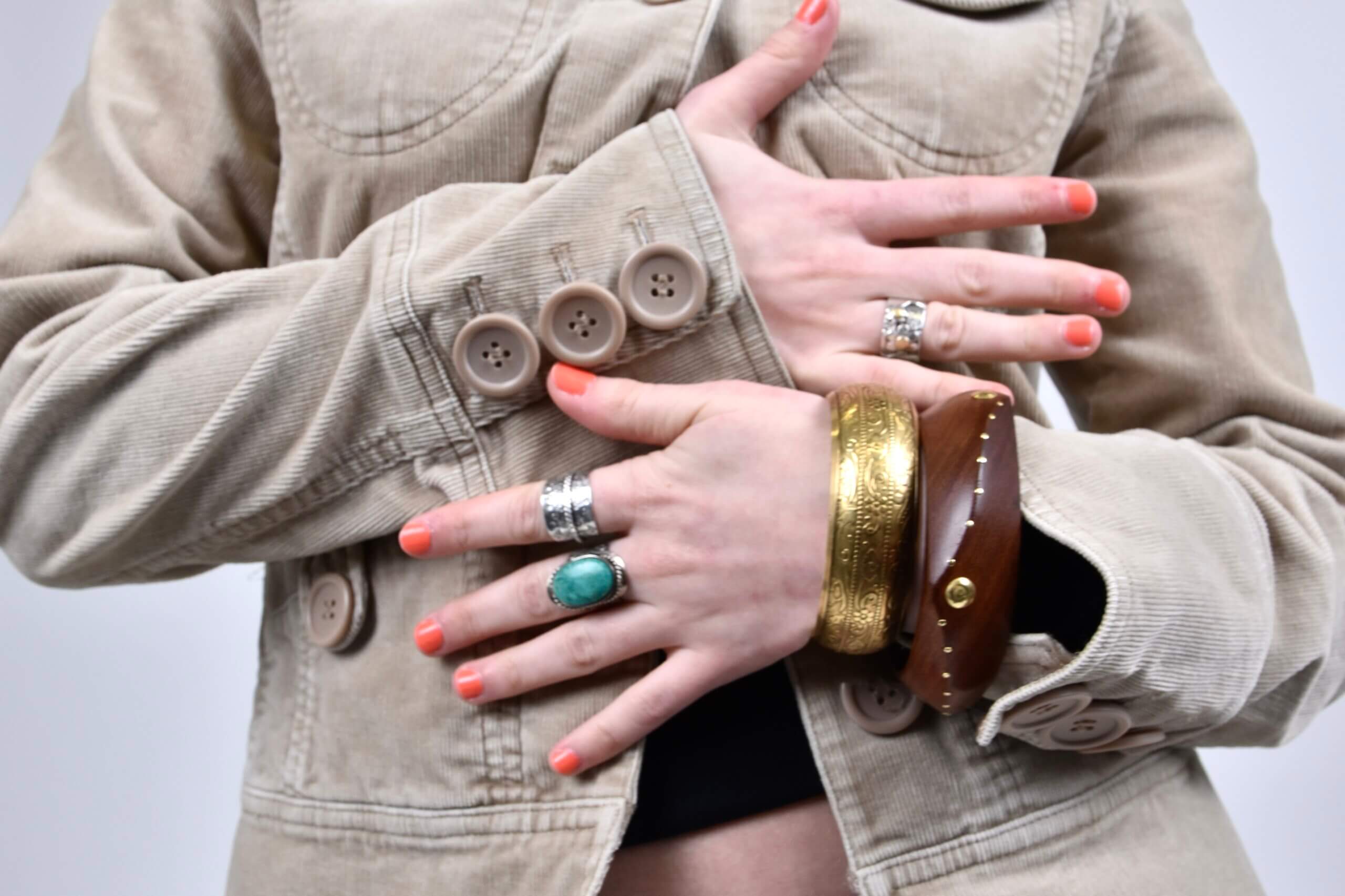 For years, my style has been inspired by 90s TV shows like Gilmore Girls and Friends. I love a low-rise jean moment reminiscent of the Gilmore Girls, paired with a more bohemian and chunky jewellery inspired by Phoebe from Friends. Most of my jewellery comes from charity shops, where you can find unique, one-of-a-kind pieces at incredibly affordable prices—these bangles were just 50p each.