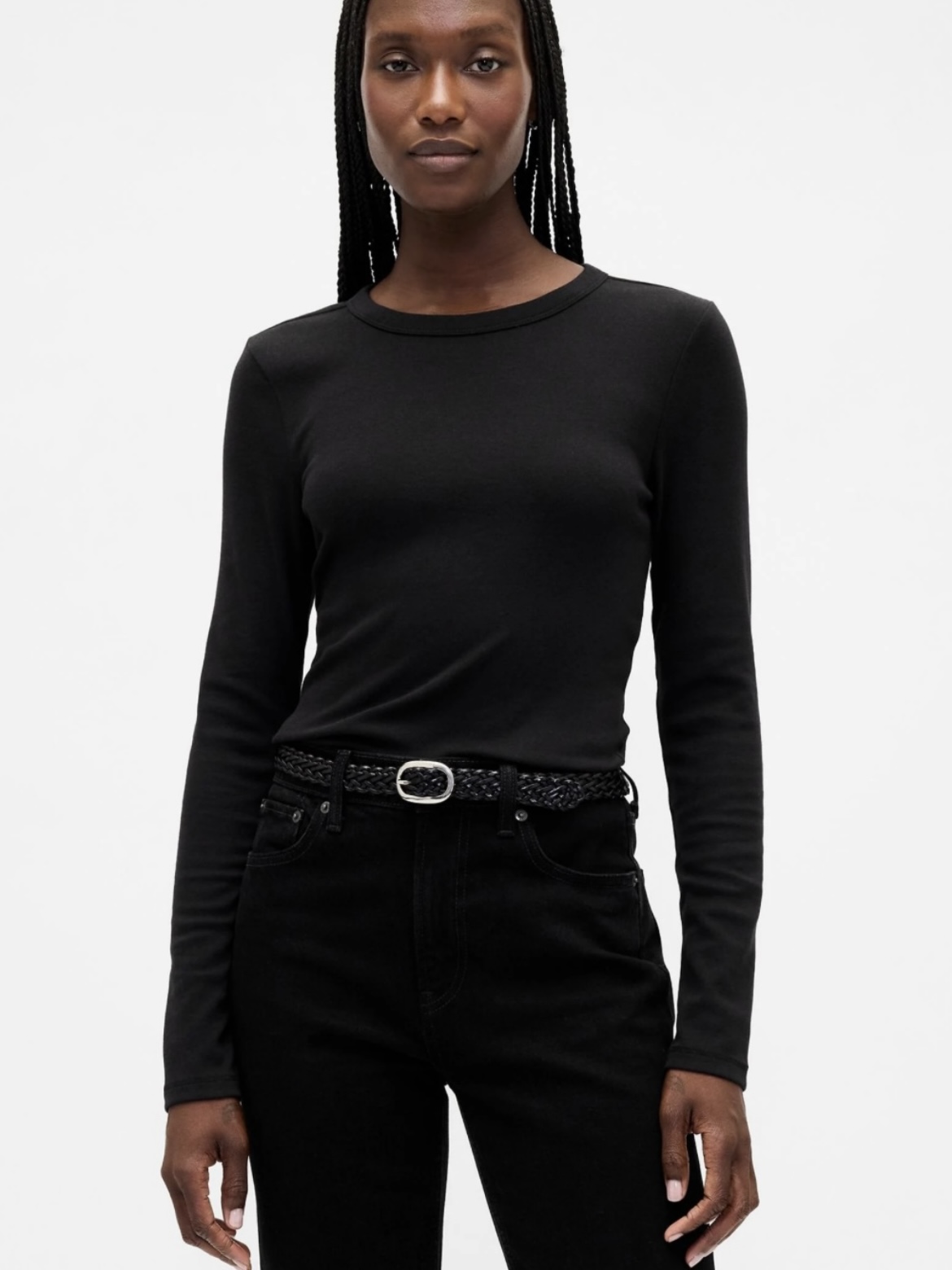To tie in with the black shoes, I styled a black long-sleeve top from GAP, £25, underneath my jacket. While I love incorporating pops of colour to my outfits, a neutral base like black really pulls everything together. This reliable, go-to black long sleeve is another wardrobe staple that I get so much wear out of.