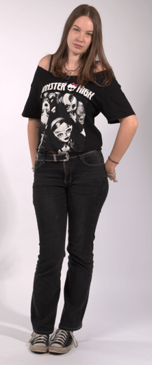 I then added my Monster High baggy tee, that I cut and stretched to make it shorter and off-the-shoulder for an extra bit of edge.