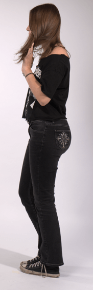 First, I decided I wanted to wear my black mid-rise jeans with white patterns on the back pockets, as I like having a little bit extra decoration to my outfit. I then decided to add my decorative belt for the same purpose.