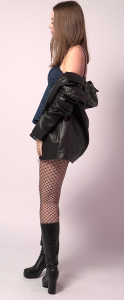 Then I decided I wanted to add black leather to my outfit, which is where I decided to make the outfit match. So, I wore my leather jacket, leather thigh-high heeled platform boots and my leather skirt. I think this matching made the outfit look so much better.