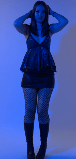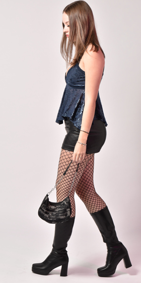 I finished the outfit with classic Primark fishnets. I decided to make my makeup a bit more dramatic and add some lashes and lipstick, to fully recreate the night-out look. I added my grey shoulder bag to accessorise, and I wore my normal every day jewellery.