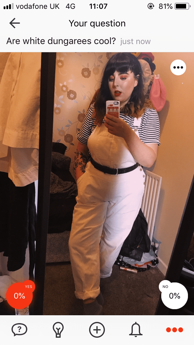 I downloaded the app myself to see what all the fuss was about and found it pretty easy to navigate around. It even displayed instructions to offer ease of use and users’ images appeared in a newsfeed- similar to the Instagram layout. A question is then posted by the user such as: Does this suit me? Is this a good fit? or Should I buy this? There is even an option to post your own question.