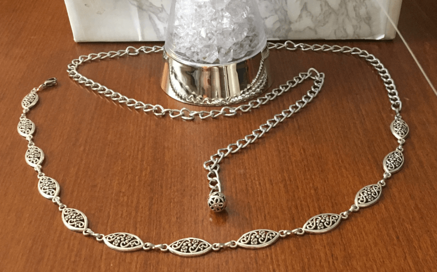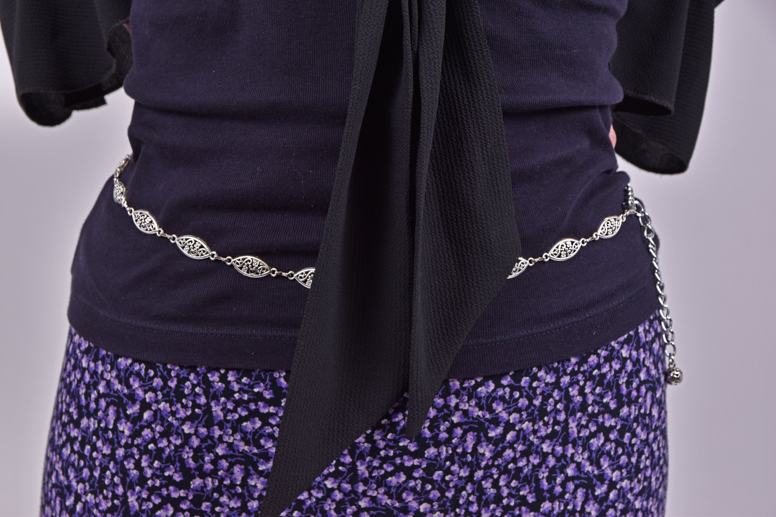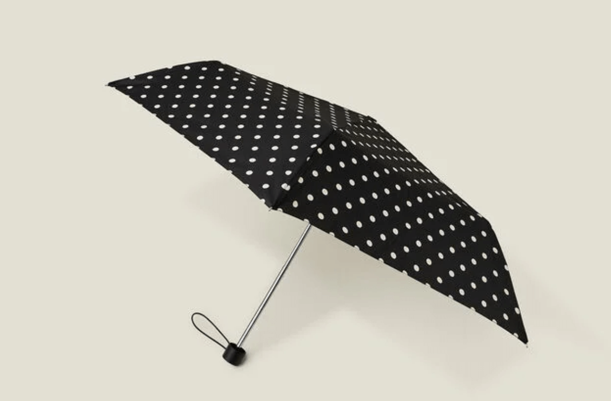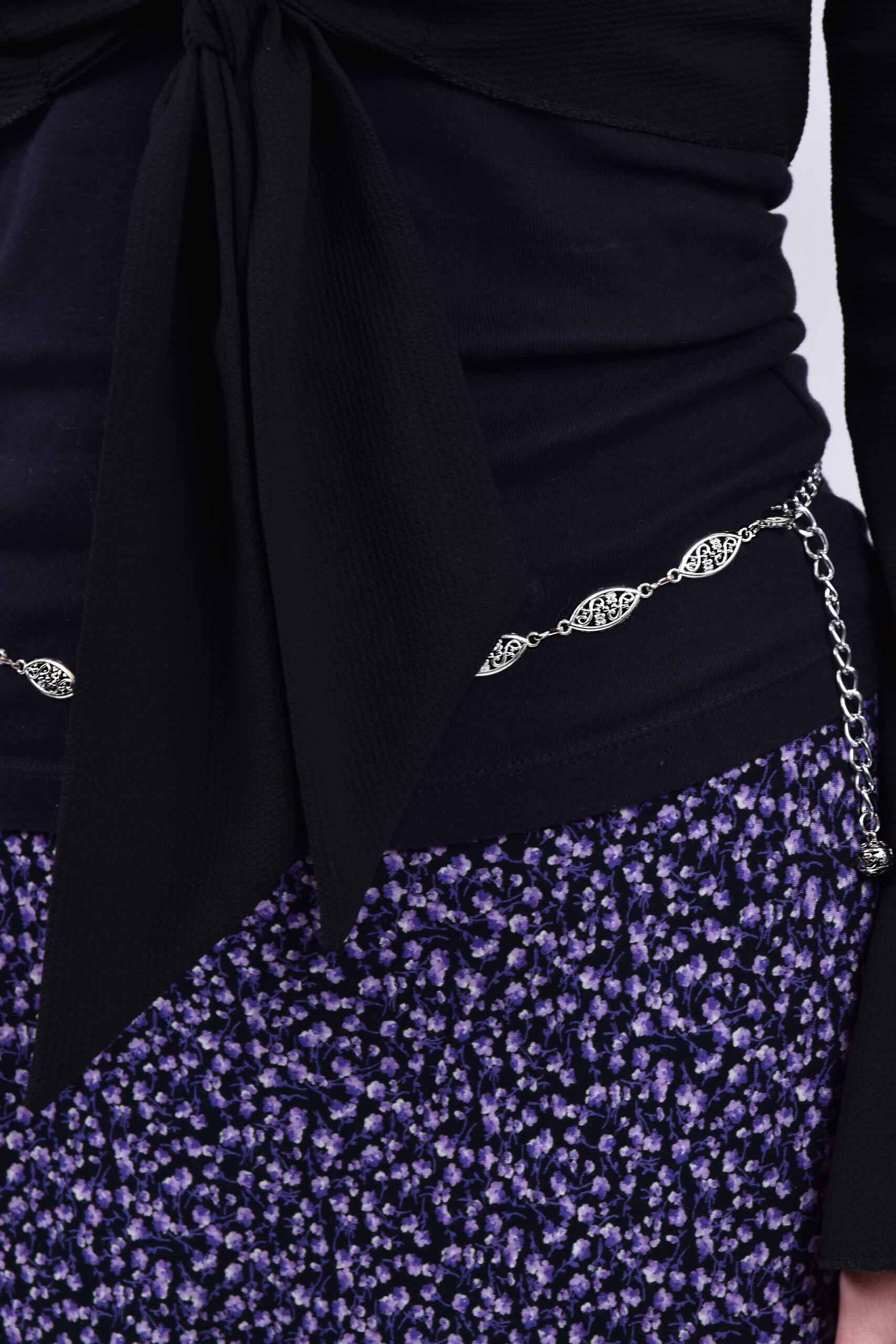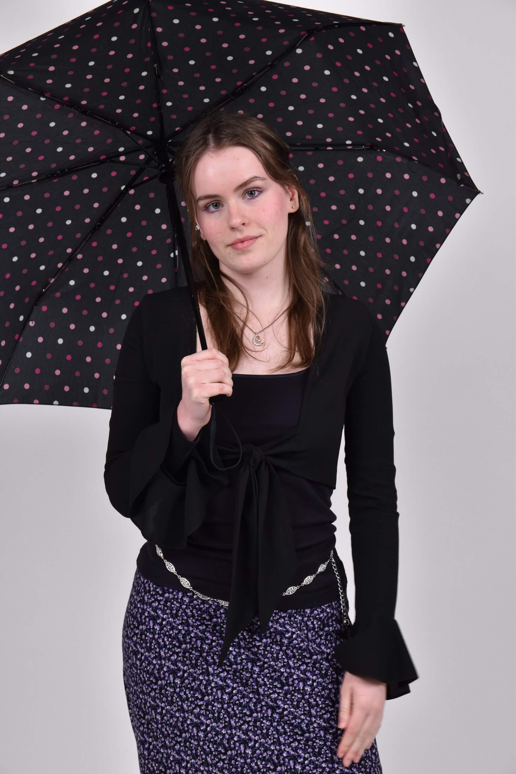 I carried a purple and black polka dot umbrella that matched my outfit as it was raining outside today. I also included a silver chain belt and moon necklace for some added visual detail. The purple eyeliner on my lower lash line was the final touch to this look.