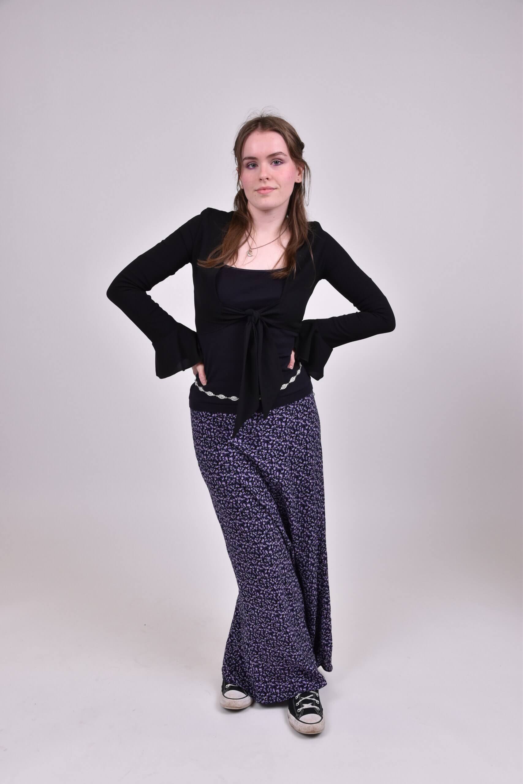 Today I styled a dark navy blue tank top and black flared sleeve wrap cardigan, with a black thermal bolero underneath. Then I matched these dark colours with the dark background of my purple floral maxi skirt and black high top converse trainers.