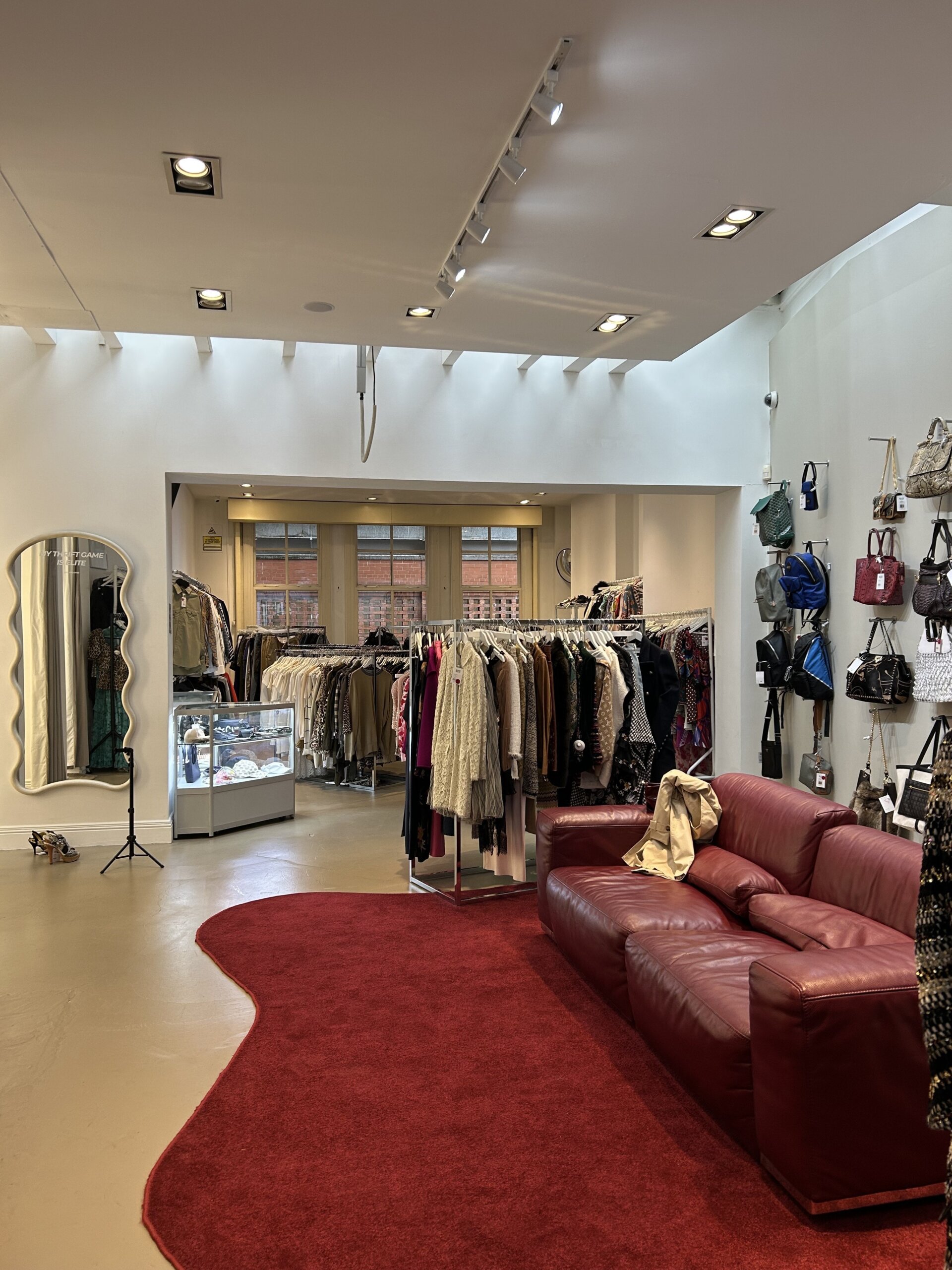 Now let me tell you about the shop itself, selling designer preloved items since 1957, it is one of the best second-hand shops in Manchester, selling mainly womenswear and having the most iconic seasonal window displays. For example in the winter seasons, the window displays furs, skiing attire, boots, sunglasses and suitcases. Backing the showcase window, there is a glass cabinet that stacks sunglasses with brands including Roberto Cavalli and Dolce & Gabbana. Behind the counter, small clutches, quilted Chanel bags and more of the high-end small bags are showcased. With three available dressing rooms and a floor length mirror outside, pose and tag the shop as the lighting is perfect for the best instagramable pictures.