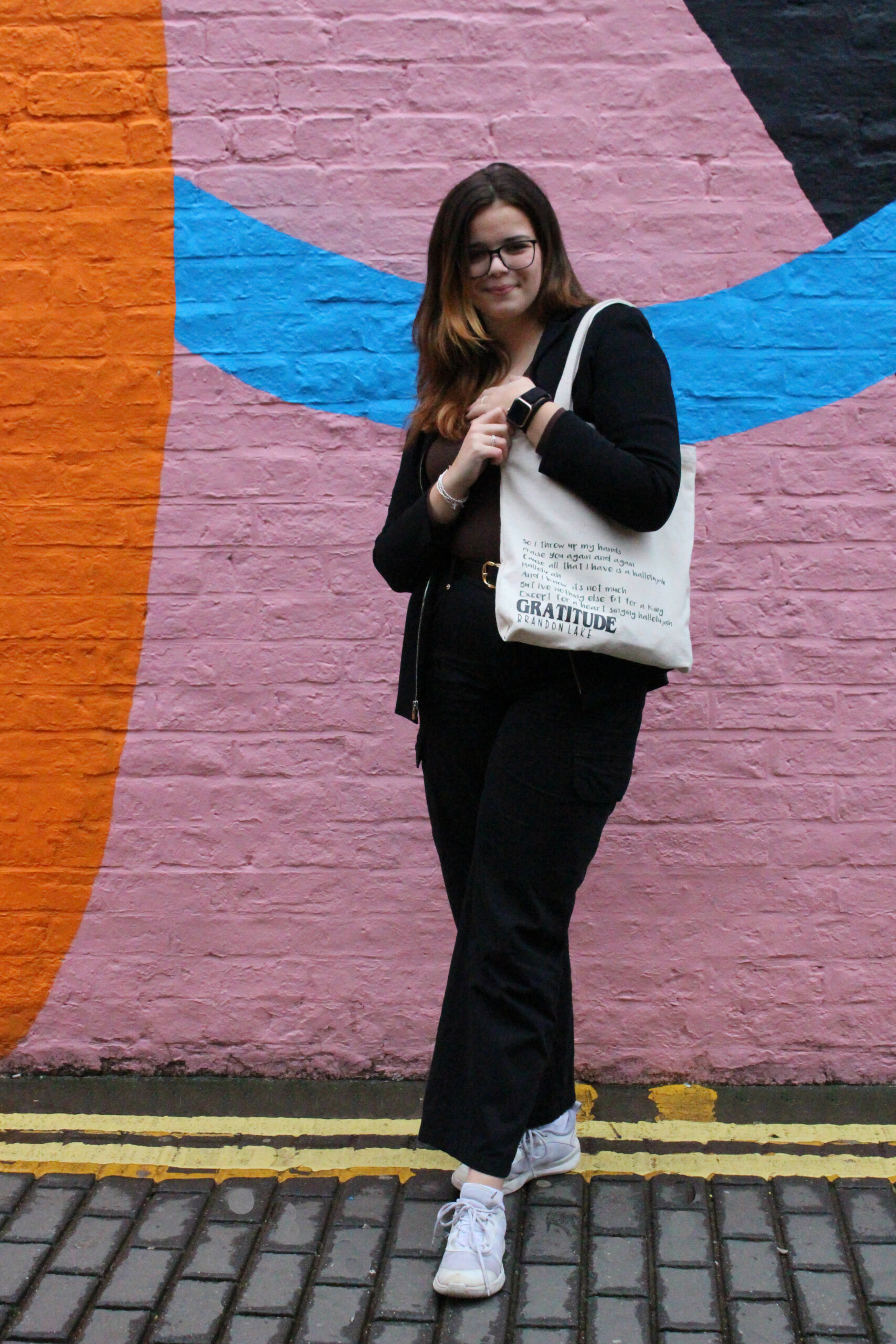 Lizzie has a particularly unique tote bag as it was made especially for her by a friend, it features the words to the song ‘Gratitude’ by Brandon Lake. The lyrics relate to religion and God something Lizzie is very passionate about and an important part of her life she wanted to include in her outfit.