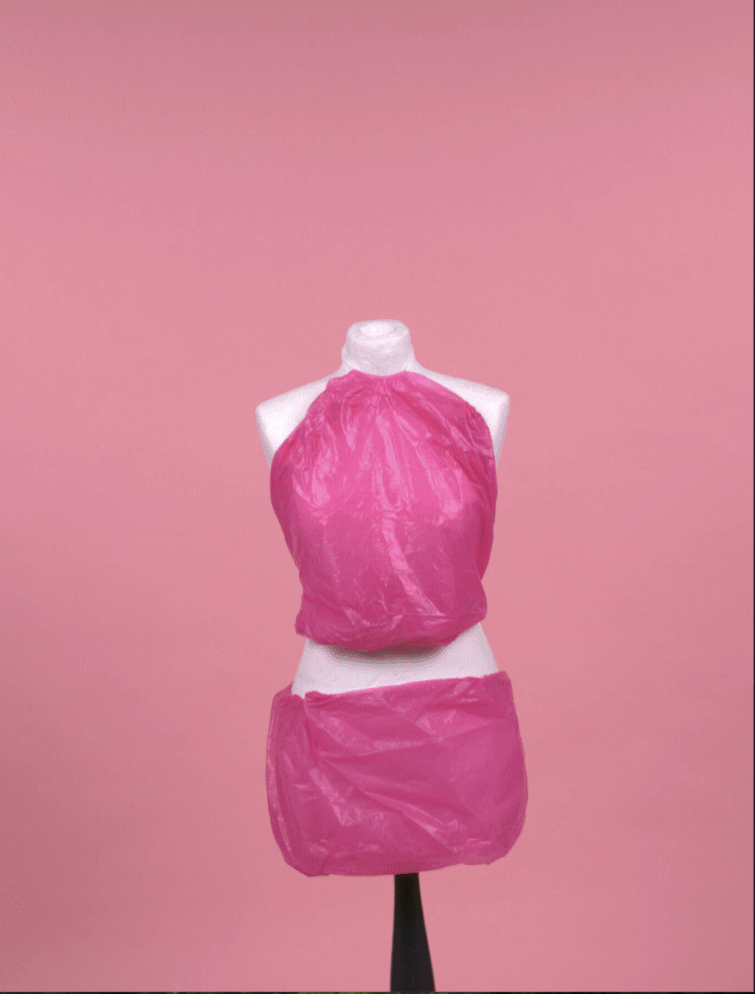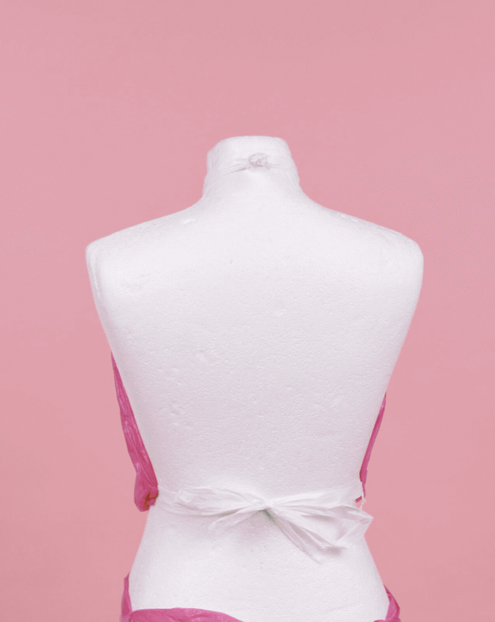 I didn’t really have an idea of what I was going to do, all I knew was that I wanted to use pink bin bags, instead of the original black/grey colour. For the halter top, I used the bin bag handles and hung them around the neck of the mannequin and had an idea of the shape of the top.