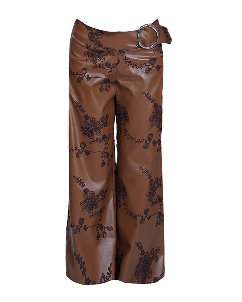 From independent designer 28NATELIER, these handcrafted faux leather pants are sure to satisfy your sustainability and fashion needs. The embroidered floral elements are reminiscent of S/S, but remain as relevant throughout the colder seasons, combined well with a knit jumper or sleek black shirt – or pair with the matching top if you’re on Santa’s nice list!